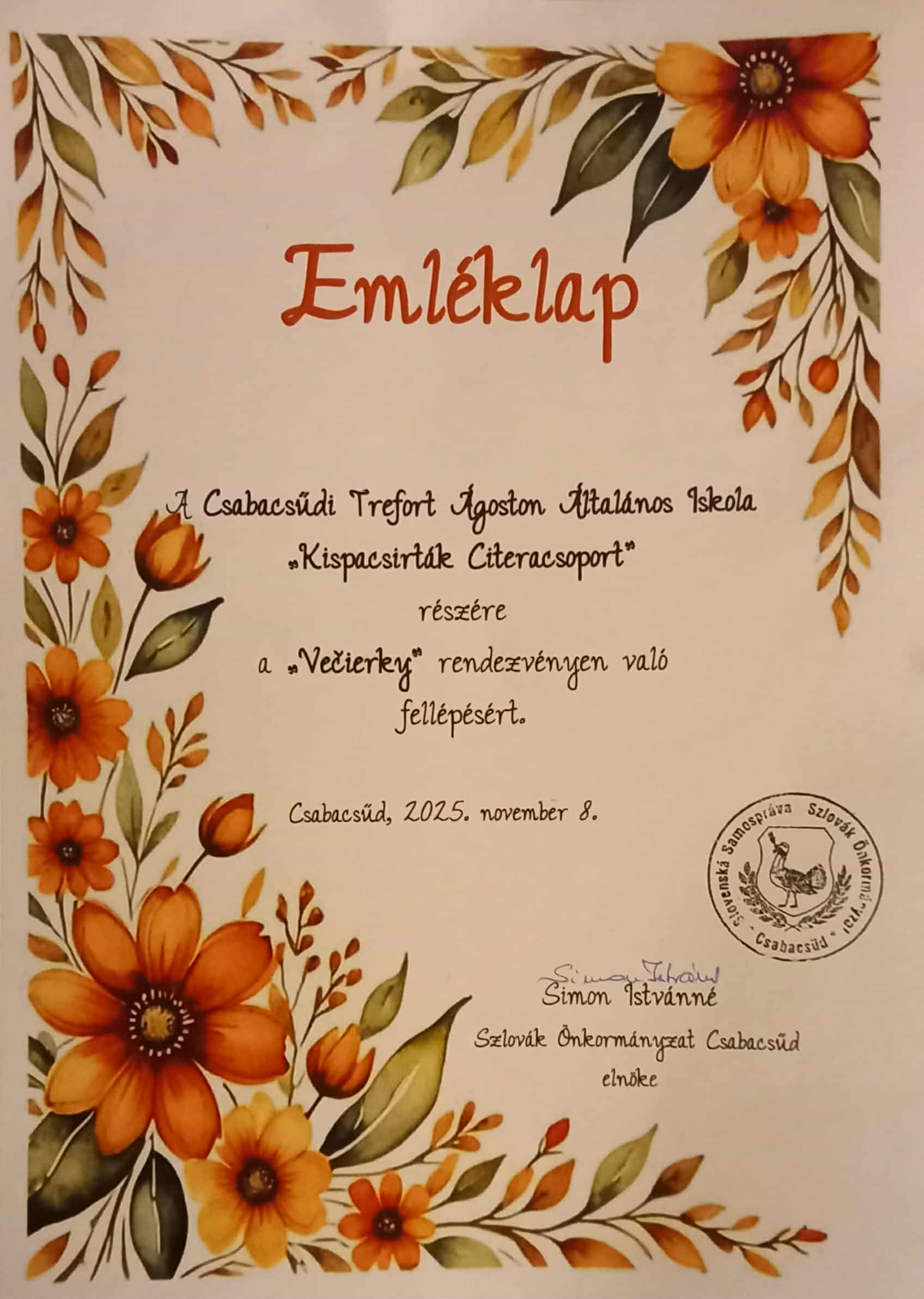 2025. november 08-án a “Kispacsirták” citerásai részt vettek a Szlovák Önkormányzat Csabacsűd és a Csabacsűdi Szlovák Kör Egyesület által szervezett kulturális programon. A fellépő citerások szlovák népdalokat adtak elő, amelyekkel a nyári citeratáborban ismerkedtek meg. Az énekesek ének-zene órán tanult magyar népdalokkal léptek föl. Az iskolai programot egy közös magyar dalcsokor citerázása zárt.