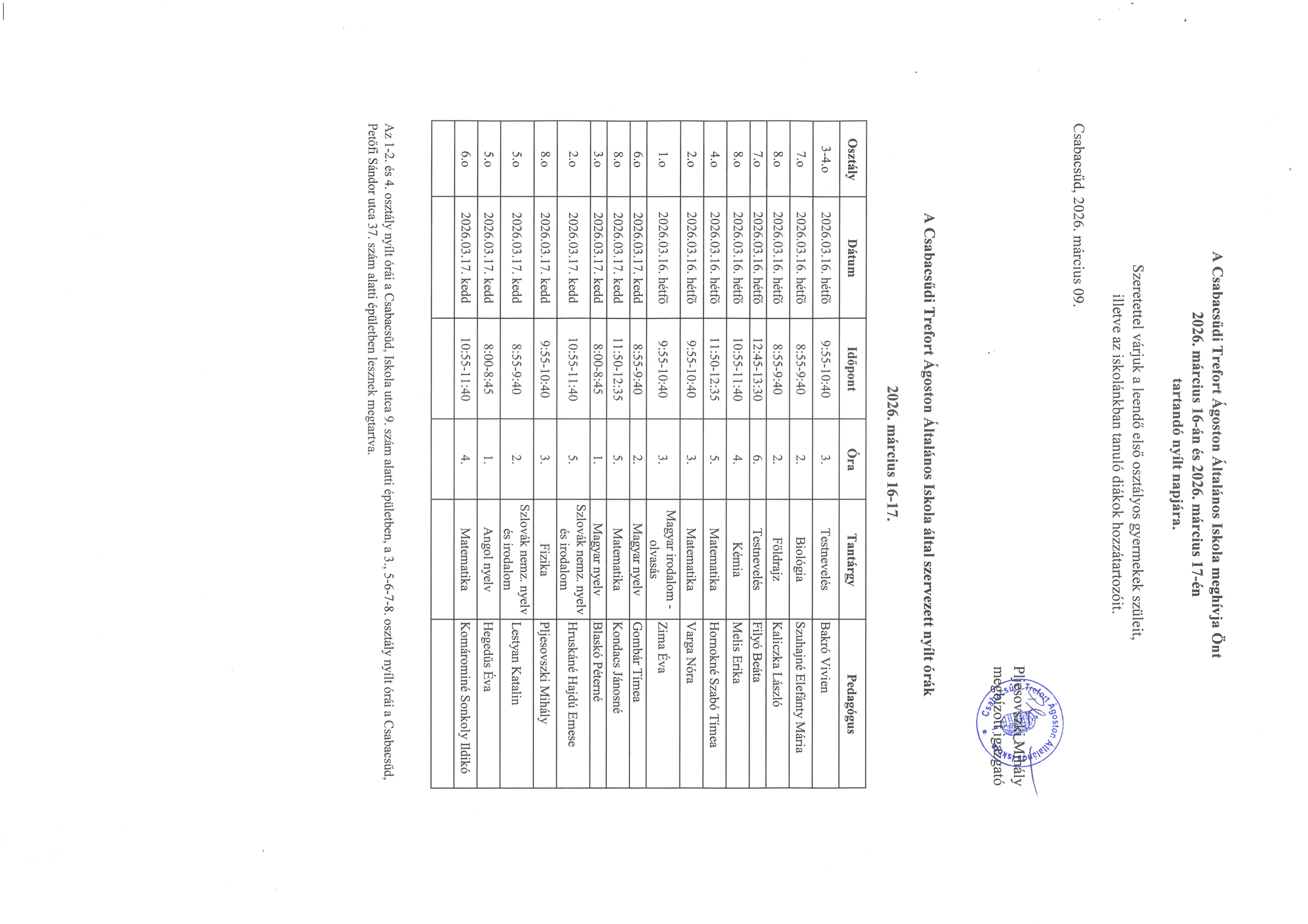A Csabacsűdi Trefort Ágoston Általános Iskola által szervezett nyílt órák